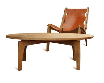 The Quilpo coffee table stands lightly with its tapered and curved legs supporting a polished elliptical top.